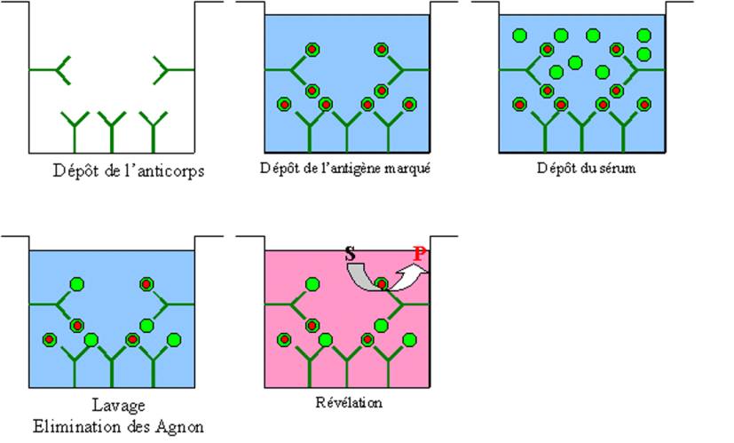 révélée en ajoutant dans le puits le substrat de l’enzyme fixée sur l’anticorps